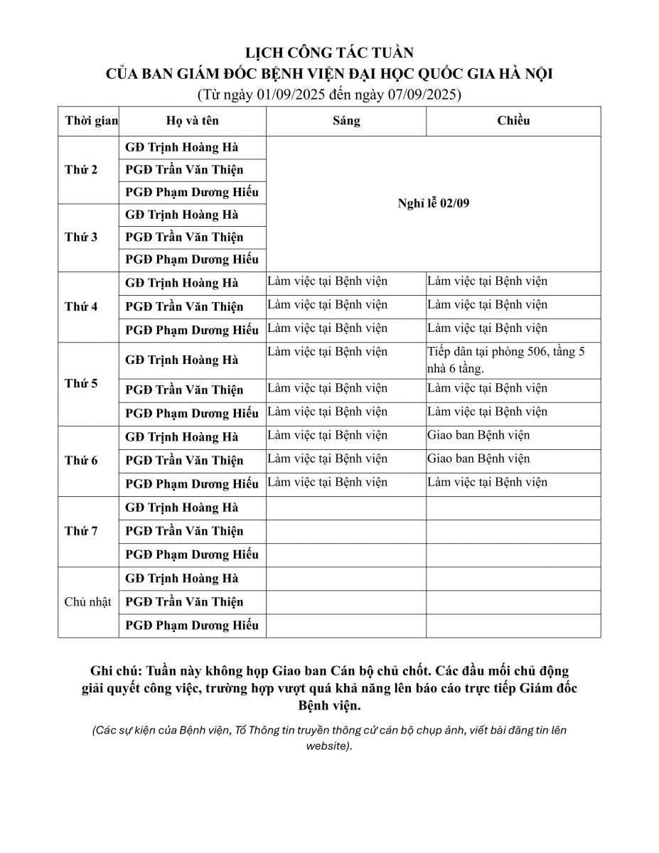 LỊCH CÔNG TÁC TUẦN CỦA BAN GIÁM ĐỐC BỆNH VIỆN ĐẠI HỌC QUỐC GIA HÀ NỘI (01/09/2025 đến 07/09/2025)